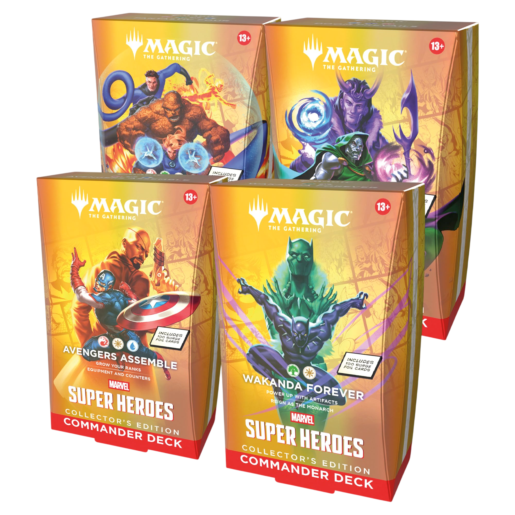 Commander decks are ready to play right out of the box and contain everything you need to play Magic’s most popular multiplayer format. Magic: The Gathering | Marvel Super Heroes Commander Decks Collector’s Edition feature four different Commander deck versions and each includes 100 surge foil cards.